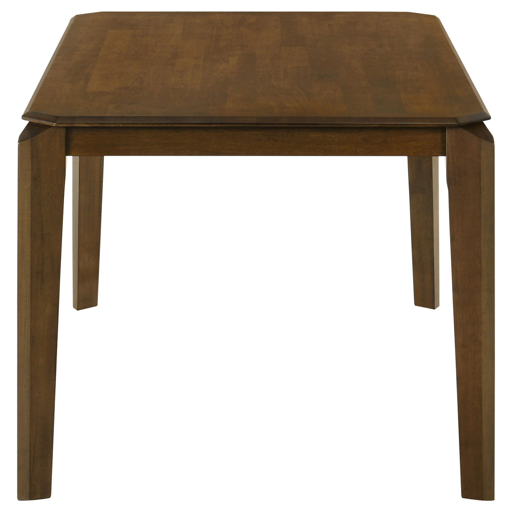 Create a refined but approachable ambiance in your dining room or kitchen with a modern rectangular dining set. Designed for a stylish but grounded look and feel, it centers on a stylish table with angular details. Its chamfered edge pairs with an almost faceted look to create engaging angularity. A dark brown wood finish complements hardwood construction, while chairs are adorned with foam seat cushions and beige upholstery for stylish contrast. The design is complete with cut corners on the tabletop and open chair backs that add visual detail and depth without overwhelming your space.