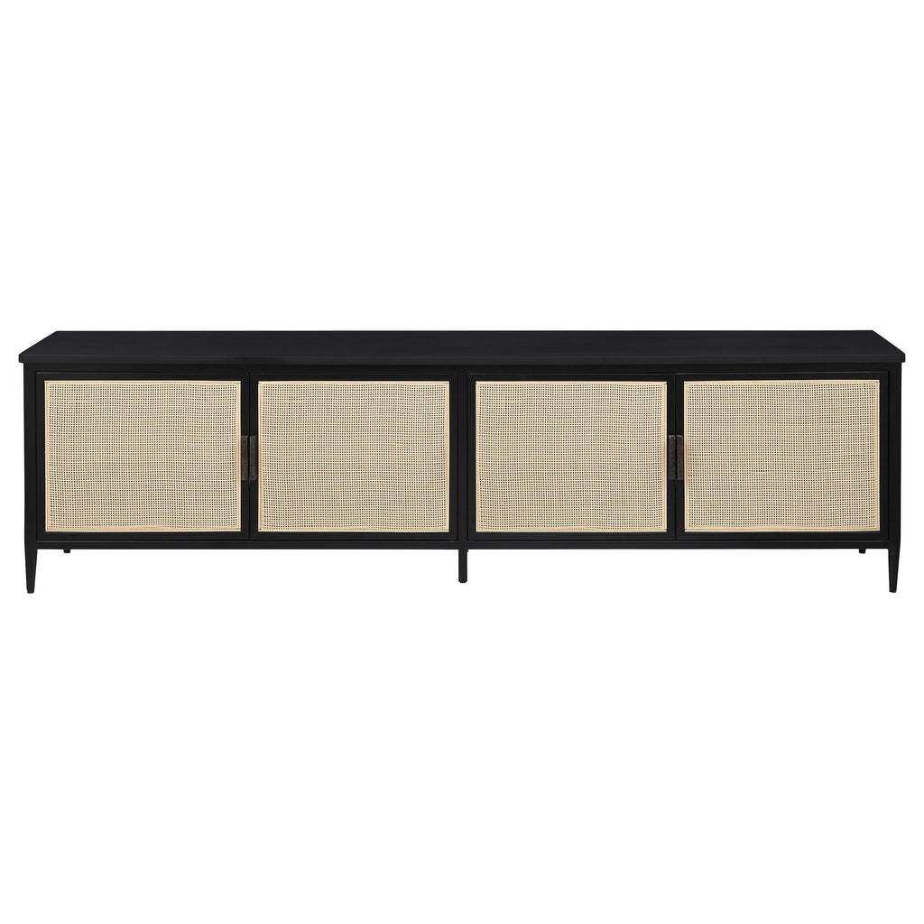 Elevate your entertainment area with this sleek 70-inch TV stand, perfect for accommodating up to a 75-inch TV. The modern design features two door cabinets with stylish radio weave polyethylene (PE) rattan fronts, adding a touch of natural texture to your space. Constructed with a durable metal frame and finished with a sleek powder coating, this stand offers both form and function. Two open-back shelves provide convenient space for devices, ensuring easy cable management and accessibility. With its contemporary appeal and thoughtful design, this TV stand enhances both the style and functionality of your living room. Key Features: • 70-inch TV stand accommodates up to a 75-inch television • Two door cabinets with radio weave PE rattan fronts for added texture • Metal frame construction with a black powder-coated finish for durability • Two tiers of open-back shelving provide easy access to devices • Designed to enhance both the style and functionality of your entertainment space