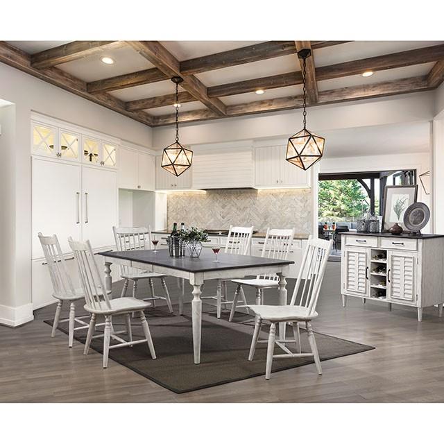 Inspired by the legendary Shaker style this dining set offers a legacy of design making and history to your home. The classic stick back design hasn't changed in centuries and with good reason, it offers a sturdy backing and an unmistakable silhouette. The turned legs are angled ever so slightly to offer a sturdier base. The table includes some upgrades like added storage shelving to the base for increased utility that is true to the shaker way of functional design. The server table offers up a unified colonial feel, with shutter design doors and a weathered finish. Bring home a piece inspired by history.