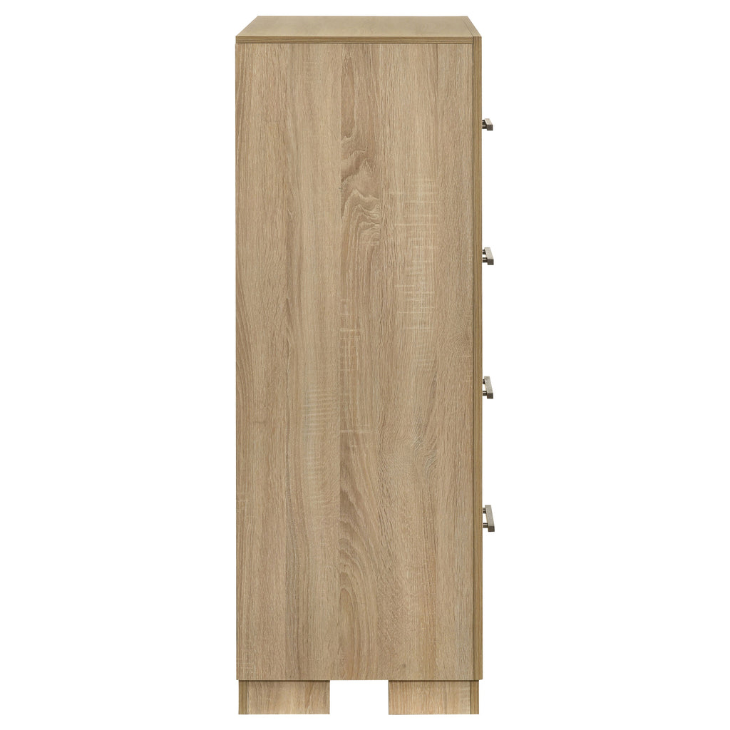 A graceful blend of form and function, this four-drawer chest brings refined charm to any bedroom. Its clean silhouette is softened by a warm light oak finish, while antique nickel hardware adds a touch of elegance. Thoughtfully crafted from engineered wood with a durable laminate veneer, it balances beauty with resilience. Smooth-gliding drawers feature English dovetail joinery, offering a timeless solution for storing clothing and daily essentials. Key Features: • Four-drawer chest with clean lines and a light oak finish for soft contemporary styling • Antique nickel hardware adds contrast and shine to the light oak wood tone • English dovetail joinery reinforces drawer durability and structure • All four drawers glide smoothly on 35mm full-extension metal glides • Crafted from engineered wood with a scratch-resistant laminate veneer exterior • Compact rectangular profile offers practical storage for bedroom or closet spaces