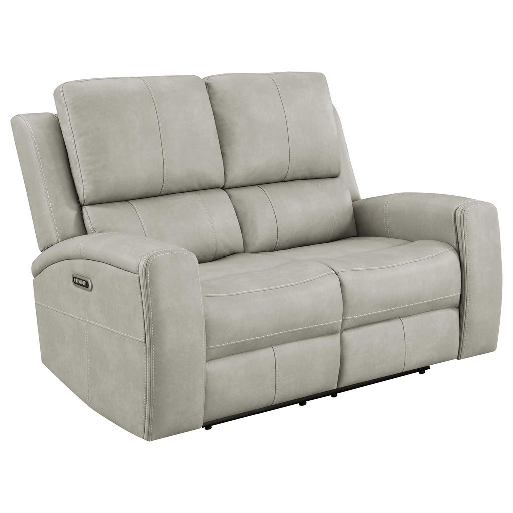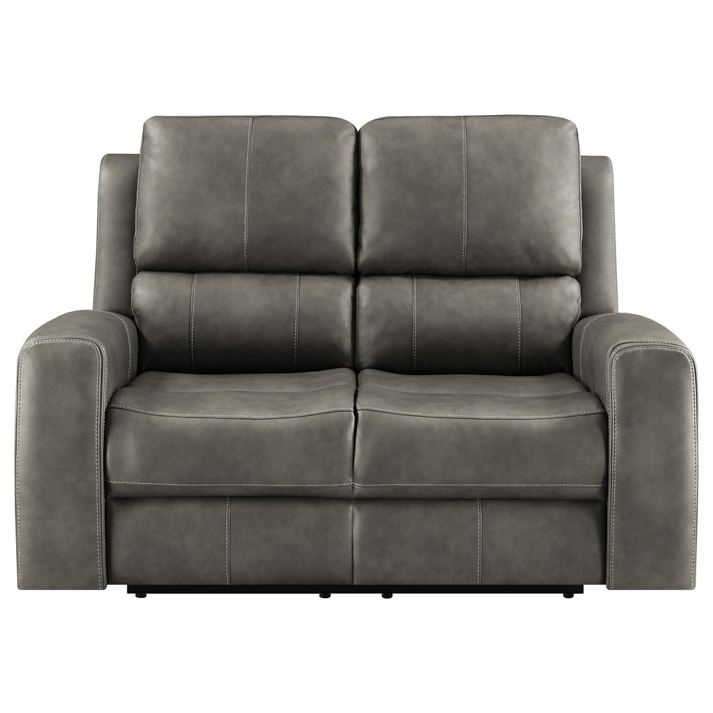 Designed to embrace your every mood, this triple power reclining loveseat transforms quiet evenings into indulgent escapes. Rich leatherette envelopes sculpted cushions, tailored with striking contrast stitching for a refined, modern aesthetic. Effortlessly adjust the power recline, headrest, and lumbar support with an integrated control panel, complete with dual USB ports to keep your devices powered and close. Thoughtfully placed armrest cup holders elevate your lounging experience, while a rear AC access port with emergency battery option ensures seamless operation, no matter the moment. Key Features: • Triple power reclining loveseat with power headrest and power lumbar for total body support • Integrated control panel includes USB A and USB C charging ports plus one-touch home button • Power recline function offers smooth motion with supportive lift from head to lumbar • Armrests conceal stainless steel cup holders for easy-access refreshment • Rear-mounted AC plug-in supports optional 9V battery for power-outage recline reset • Charcoal leatherette upholstery with contrast stitching adds tailored texture and depth