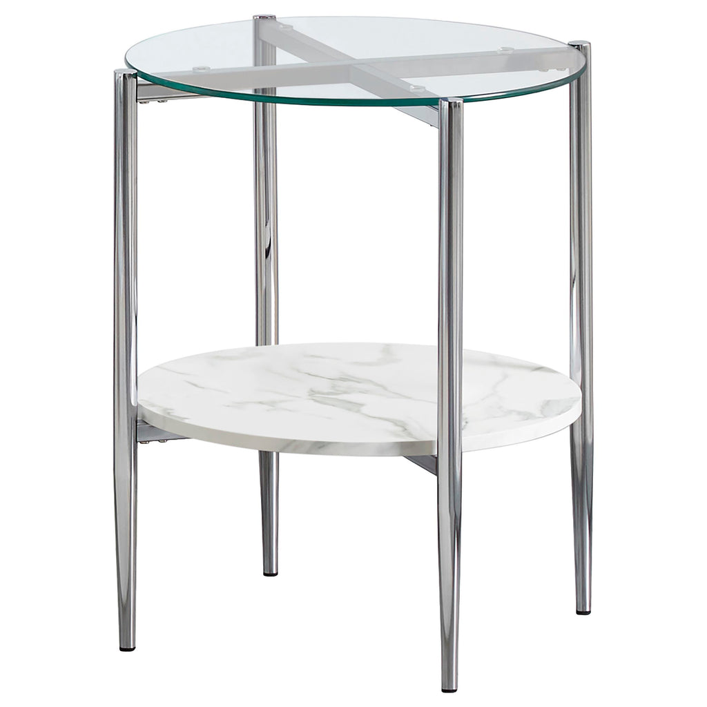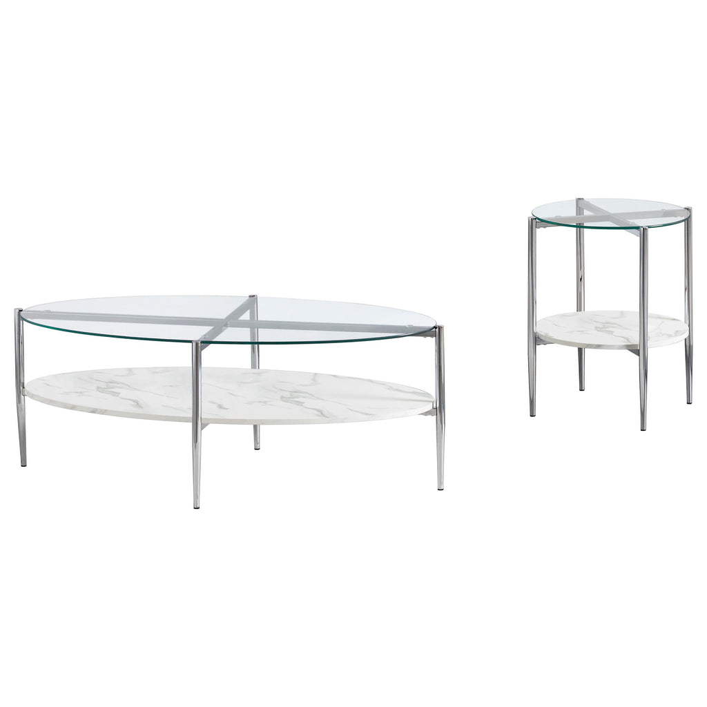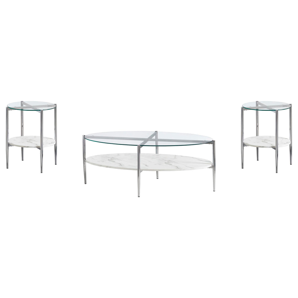 Complete your living room with this stylish coffee table set, featuring a matching oval coffee table and round end table. The clear tempered glass tops bring a sleek and modern vibe, while the white faux marble shelves add functional storage with a sophisticated touch. Each piece is supported by a sturdy metal frame electroplated in polished chrome, ensuring durability and elegance. Tapered legs further enhance the contemporary design, making this set a perfect blend of style and utility.