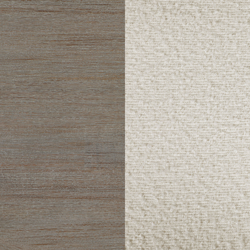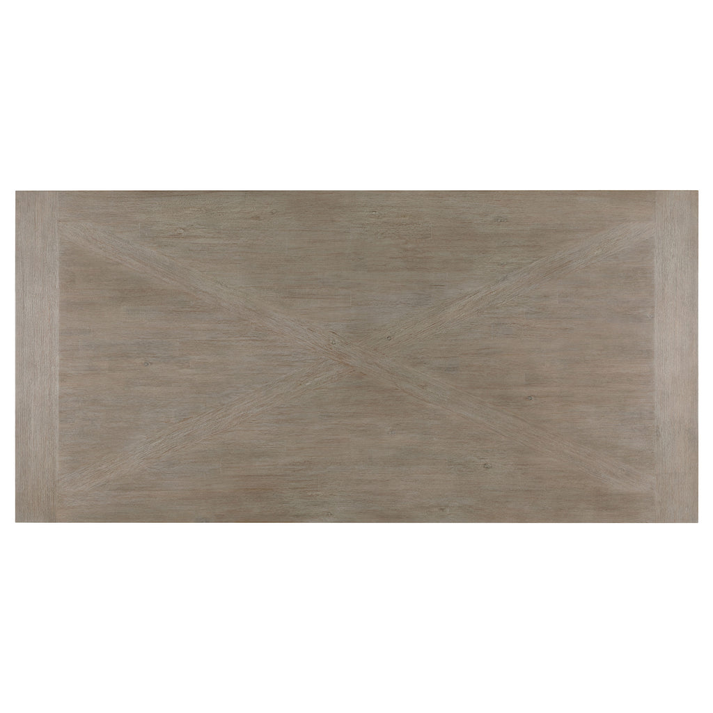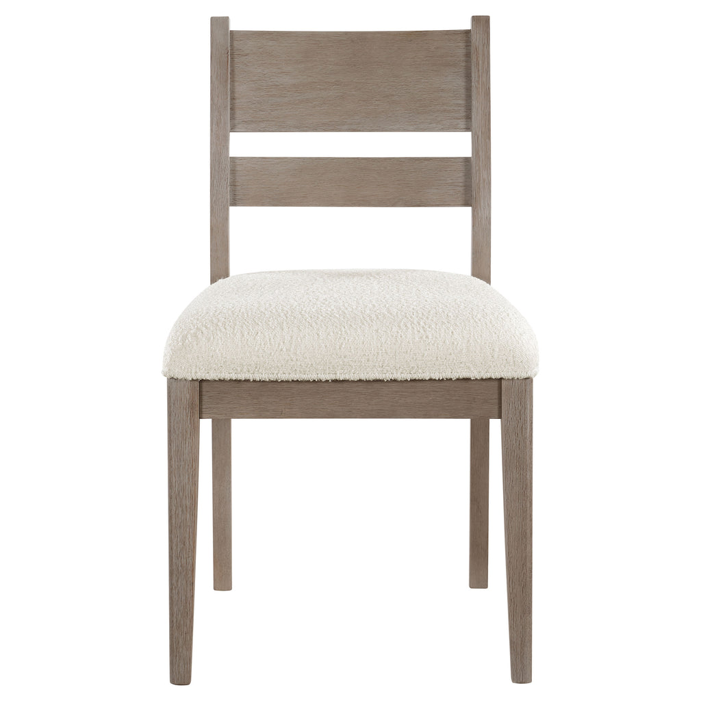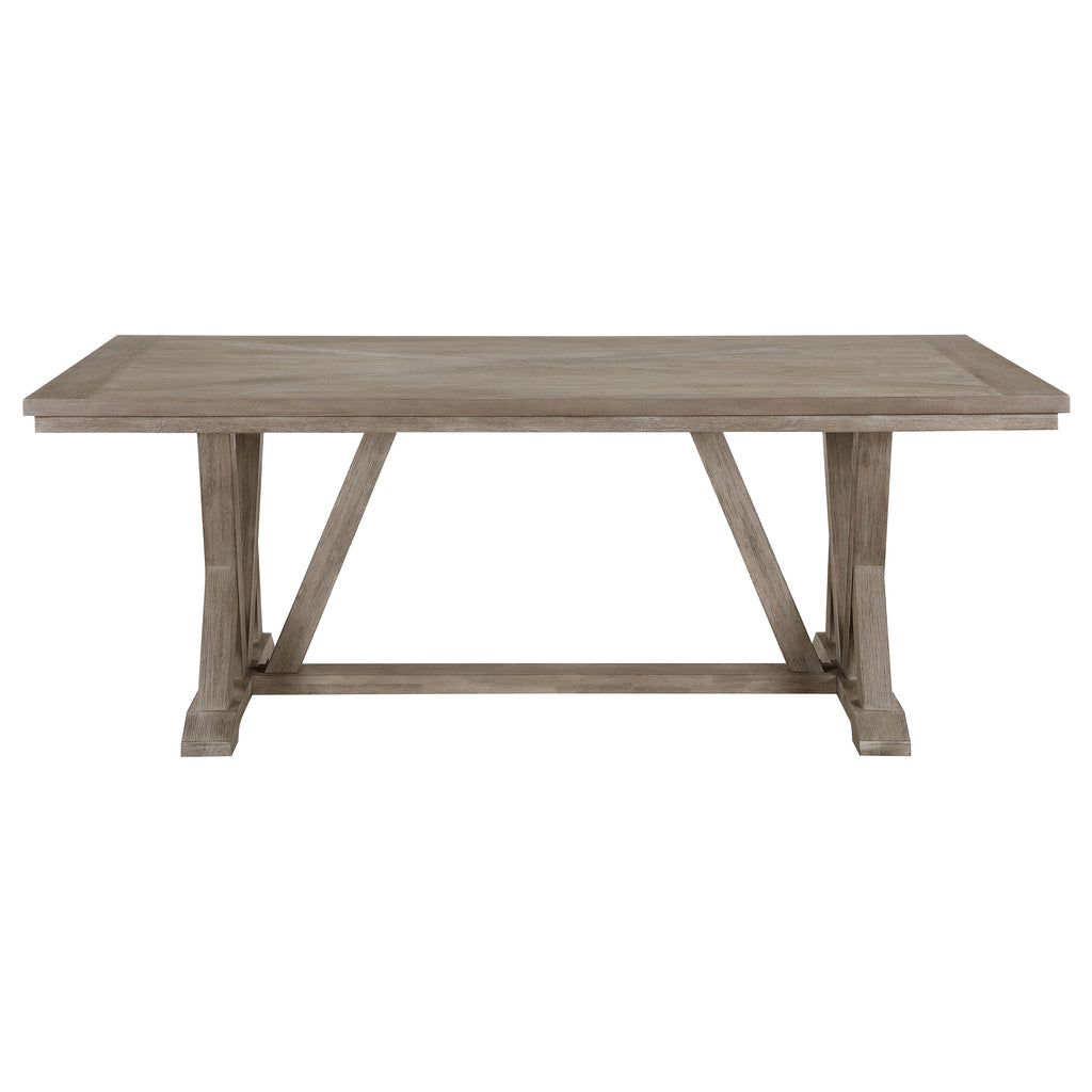 Trestle inspired style brings charming character to a five-piece modern farmhouse dining room set. It focuses on a rectangular dining table, complete with four side chairs that create a cohesive look with a casual coastal grey finish. Cream upholstery adds a fresh, bright touch, perfect for an inviting kitchen or dining room. Chairs feature modified ladder backs, offering artisan appeal, while the decorative table base instills the perfect touch of dimensionality. Foam padding adds comfort to seats, perfect for family and friends to enjoy a meal and conversation. Key Features: • Approachable modern farmhouse style infuses a rectangular wood dining table and four side chairs • Features acacia veneer over acacia wood and MDF to create stability and style • Coastal grey wood grain finish is light and on-trend, perfect for casual family dining spaces • Angular supports and trestle details create a sense of texture and dimension for an artisan look • Chairs showcase a charming ladderback design with creamy white upholstery over padded seats