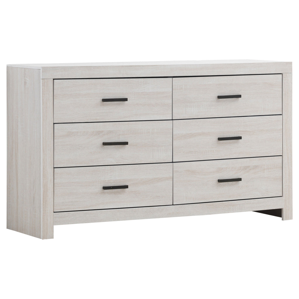 This six-drawer dresser offers a perfect balance of style and storage. Its clean-lined frame complements modern and contemporary spaces, while six spacious drawers provide ample room for clothing and accessories. Crafted from engineered wood with a durable laminate veneer, this dresser is built for everyday use. Matte dark bronze handles add a refined contrast, enhancing its sleek and functional design. Key Features: • Six-drawer dresser with a sleek and modern silhouette • Barrel oak finish enhances the natural wood grain-inspired look • Spacious drawers provide ample storage for clothing and essentials • Sturdy engineered wood construction ensures lasting durability • Matte dark bronze handles contrast beautifully with the finish • Durable laminate veneer resists scratches, stains, and wear