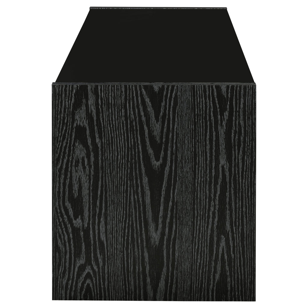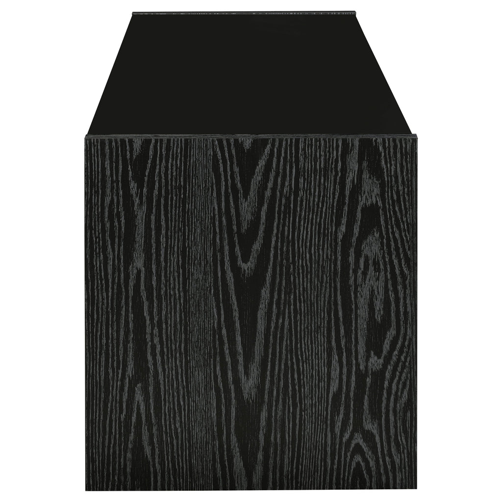 Enhance your modern living space with this 61-inch TV stand in a rich black oak finish. Designed to accommodate TVs up to 70 inches, it features a sleek profile accented by brushed silver hardware for a contemporary contrast. Two open compartments provide easy access for media components, while three spacious drawers store accessories, remotes, and gaming essentials. Crafted from engineered wood with a black tempered glass top, this stylish TV stand blends function and elegance with lasting durability. Key Features: • 61-inch TV stand accommodates TVs up to 70 inches • Black oak finish with silver hardware for modern appeal • Three drawers provide concealed storage for accessories • Two open shelves hold media devices and entertainment gear • Tempered black glass top adds sleek visual sophistication • Crafted from engineered wood and laminate for durability