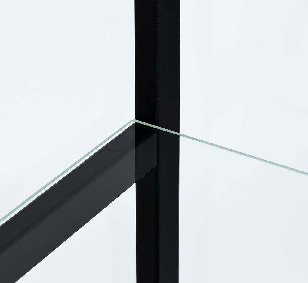 A modern version of a true classic makes a fabulous addition to a transitional space. With linear styling and a fresh look, this curio cabinet offers a perfect venue for showcasing treasured decor. Bold black tops a simple frame, top, and base. Tempered glass shelves create transparent space for display. Access its interior easily with push-to-open doors. Key Features: • Modern curio cabinet in black finish • One reversible magnetic push-to-open clear tempered glass door provides ease of access and strength • Three tiers of shelving for additional display space • Available in a variety of sizes • Glass, pine, particle board, and laminate construction