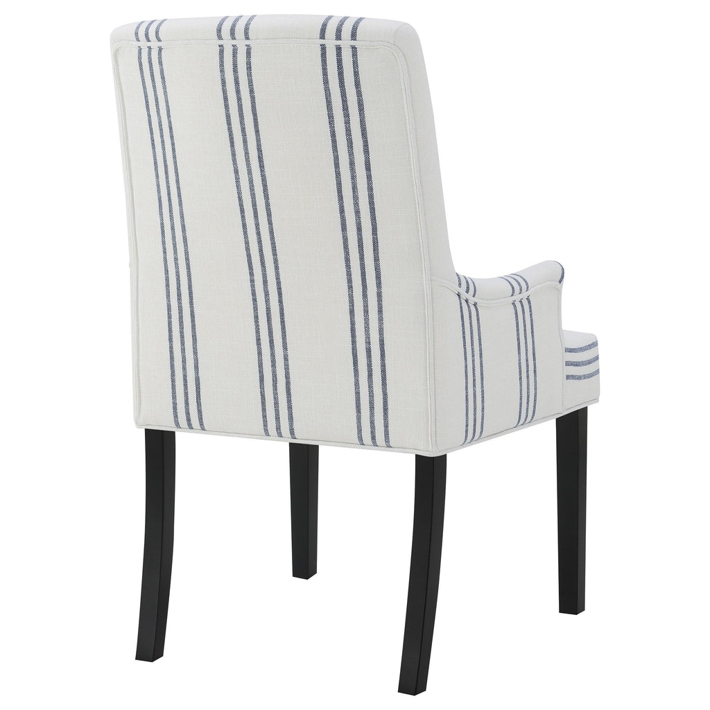 This armchair adds a refined yet relaxed charm to your dining space, blending comfort with casual elegance. Upholstered in linen-like beige fabric with blue stripes, it offers a timeless aesthetic. The padded seat, backrest, and gracefully curved arms ensure both comfort and style. Built with a sturdy Asian hardwood frame and a sleek black finish, this armchair provides lasting durability. Its versatile design works beautifully in transitional, modern, or farmhouse-inspired interiors.