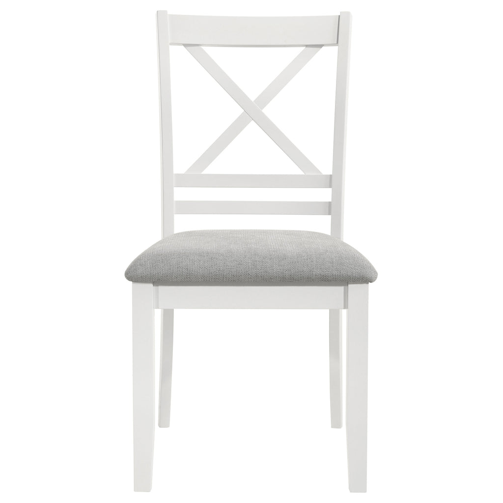 Enjoy delicious dinners and the company of friends and family when gathered at this five-piece cottage dining set. Offering casual charm, the set centers on a two=tone rectangular dining table that comfortably seats six. The tabletop is a warm, natural wood finish that plays well in modern farmhouse and casual contemporary decor, setting a relaxed tone for meals, games, and even homework. The table's base receives a white finish to complement its clean-lined design and gently tapered legs. Four chairs are included with the set, offering a white finish with an open back decorative with an X-cross detail and a foam-padded seat in light gray upholstery that maintains a soothing, neutral color palette.