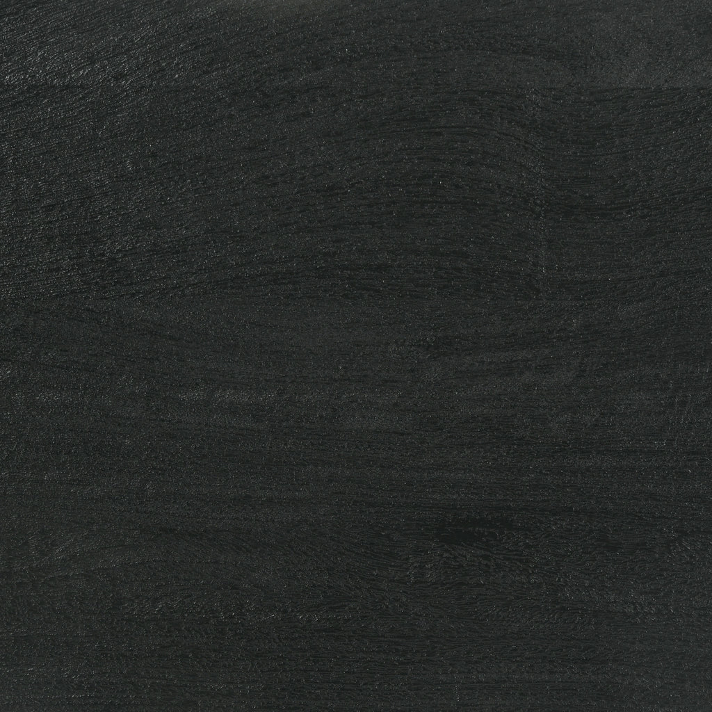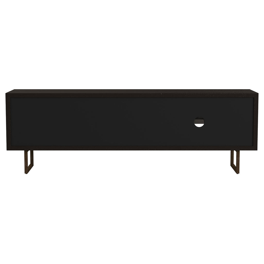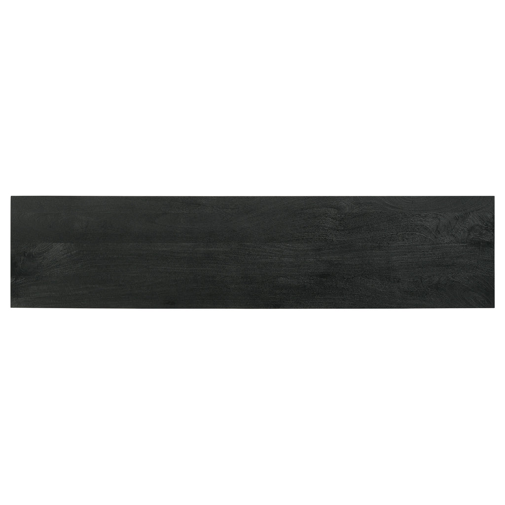 A dramatic charcoal black finish coats wood products construction, adding a bold look to this casual yet elegant TV stand. Gather entertainment-related gear and organize it in this tasteful stand built of mango wood with a rustic aesthetic. Set atop black finish iron bracket legs, it creates a sturdy venue for a large flat-screen TV. Components find room in two side compartments, as incidentals and media may be stashed on a fixed shelf behind two side doors with ornate iron hardware. Avoid clutter with a pre-cut wire management hole. Key Features: • Elevate your entertainment area with a TV stand featuring a dramatic charcoal black finish, infusing a bold and elegant touch • Crafted from wood products with a mango wood rustic aesthetic, this stand offers a tasteful solution for organizing your entertainment-related gear • Sturdy iron bracket legs in a matching black finish provide a stable base for your large flat-screen TV • Keep your components organized in two side compartments, while incidentals and media items can be stored behind two side doors adorned with ornate iron hardware • Say goodbye to cable clutter with a convenient pre-cut wire management hole, maintaining a clean and tidy look in your living space
