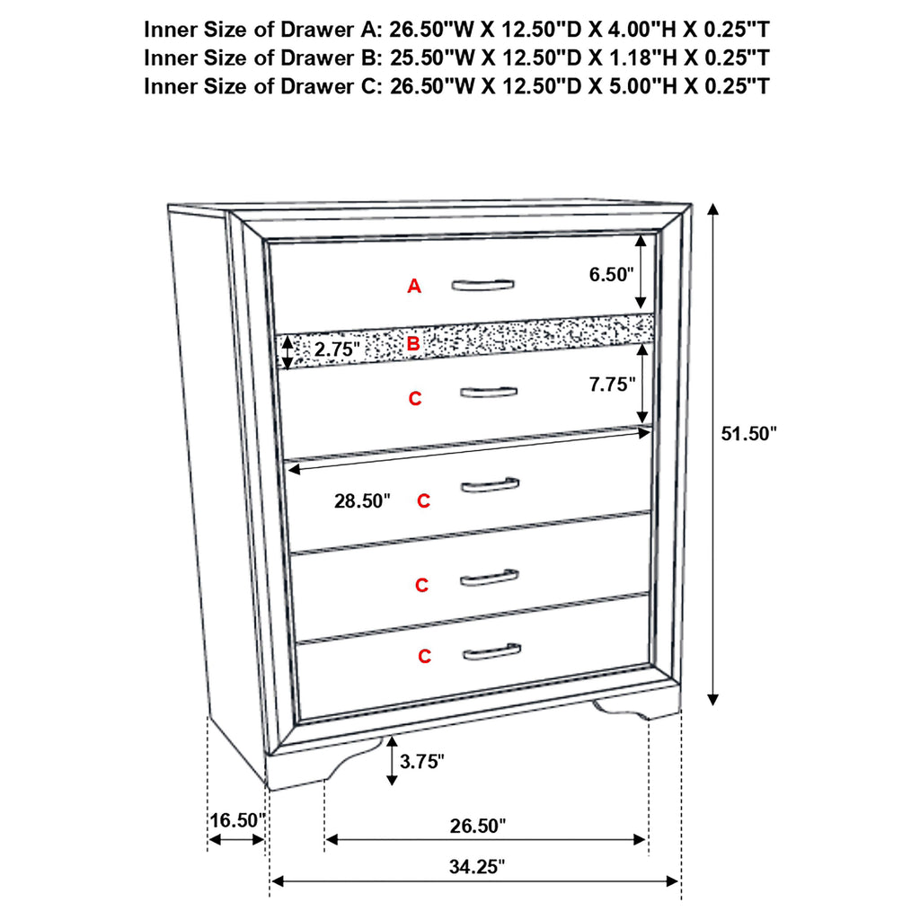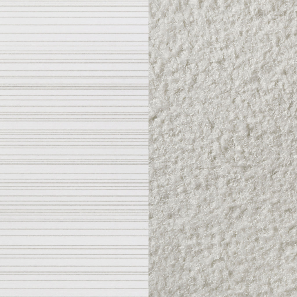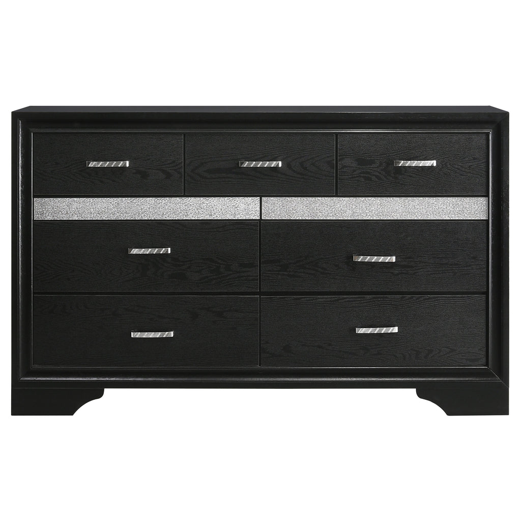 Encourage a glam vibe in your refined bedroom with a modern four-piece bedroom set. Centering on a stylish bed with an upholstered headboard and low footboard, the set includes a two-drawer nightstand for easy bedside storage and display space. A seven drawer dresser and mirror complete the set, adding diamond-like trim across its face that catches the light and offers a sophisticated touch. Bracket feet add a touch of dimensionality and movement to each piece and jewel-like bar pulls add intriguing sparkle. A cool white finish is textured, while white finish trim is smooth, creating a touch of textural contrast that add engaging style.