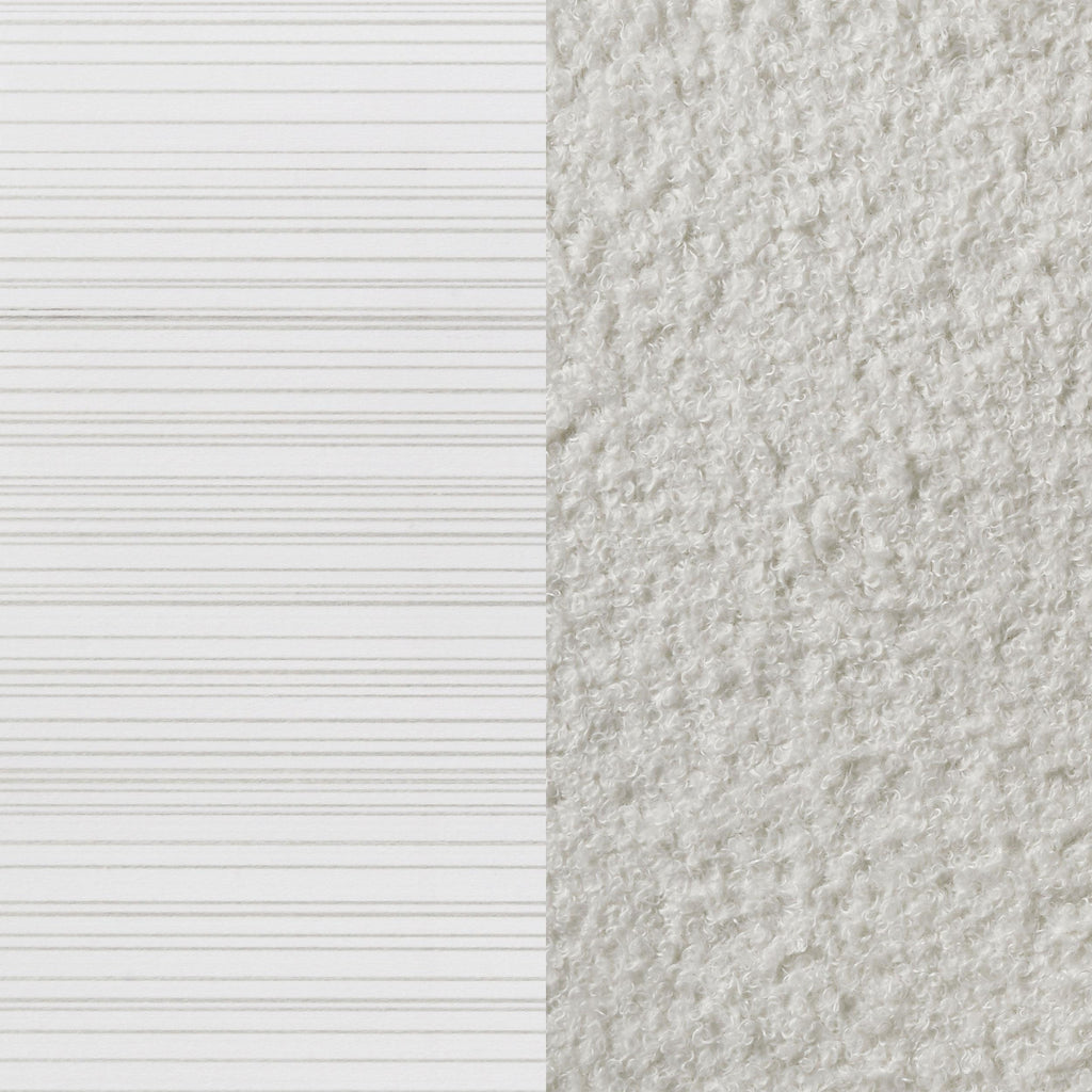 Introduce a little bit of glam flair to your bedroom with a modern upholstered bed. Featuring padded white fabric panels, the headboard is complete with molded trim and a horizontal stripe that glitters in the light. A matching vertical stripe on the low footboard is the perfect complement. A white finish is lightly textured on the panel footboard and rails, while trim is smooth and cool. The bed is complete with slats and center legs for added support and requires a foundation.