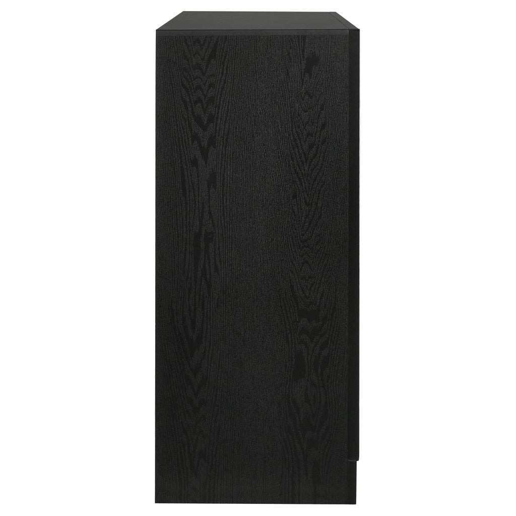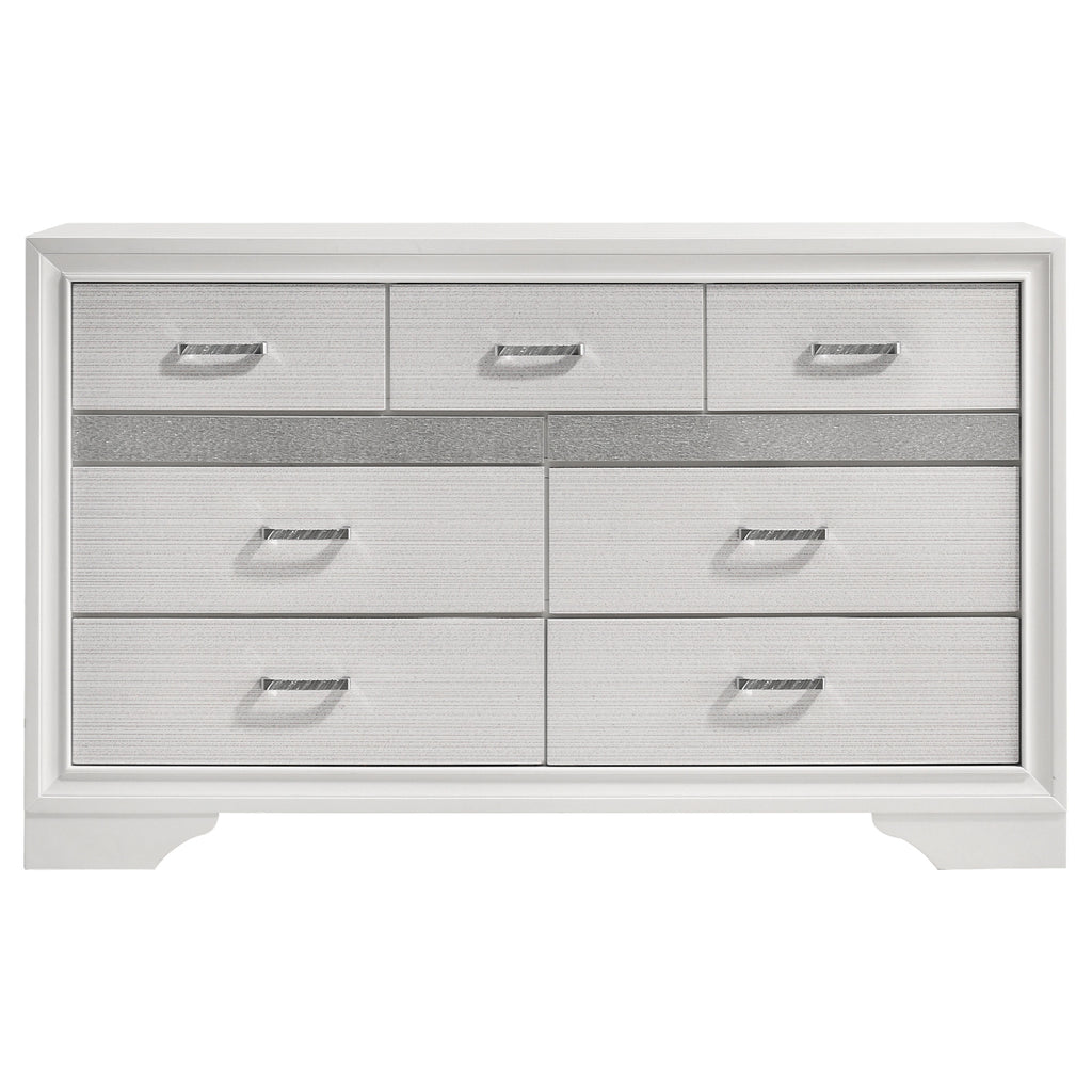Infuse your space with sophisticated grace. The chic design of this beautiful dresser lends a touch of elegance to any bedroom. Felt-lined drawers keep delicate belongings safe and secure. A hidden jewelry drawer offers a discreet place to store your valuables. Complete with a glittery panel across the front, this piece exudes sparkling opulence. Key Features: • Nine-drawer dresser provides ample clothing storage • Hidden felt-lined drawer located behind glitter accent strip • Crystal hardware stands out against bright white surfaces • Smooth drawer operation with full-extension glides • Bracket-style base and beveled edges offer timeless form • Engineered wood and laminate build ensure durability