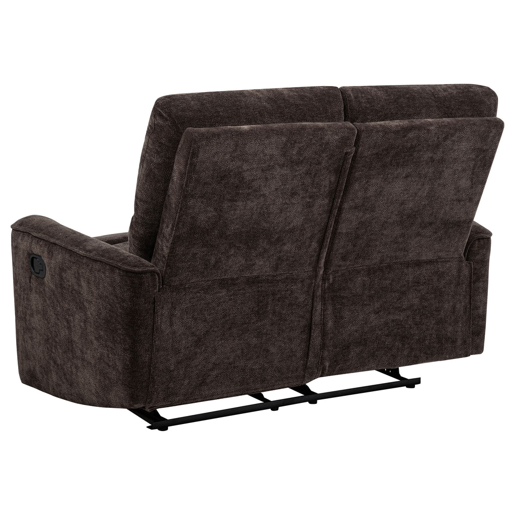 Crafted for comfort and connection, this reclining sofa set blends soft support with everyday ease. Deep cushions and channel-tufted backs provide gentle contouring, while smooth manual recline offers a personalized lounge experience. Wrapped in plush chenille and framed in durable wood and metal, each piece invites you to unwind with effortless comfort. Whether for quiet moments or shared spaces, it’s a set made for lasting relaxation. Key Features: • Reclining sofa set with plush seating and smooth manual motion for everyday comfort • Dark brown chenille upholstery adds cozy warmth and inviting softness to each piece • Channel-tufted backs offer ergonomic support and visual texture across the seating • Wide padded armrests and deep cushions create full-body relaxation in every seat • Crafted from fabric, metal, plywood, and foam for long-lasting strength and support • Perfect for casual living rooms centered around ease, comfort, and connection