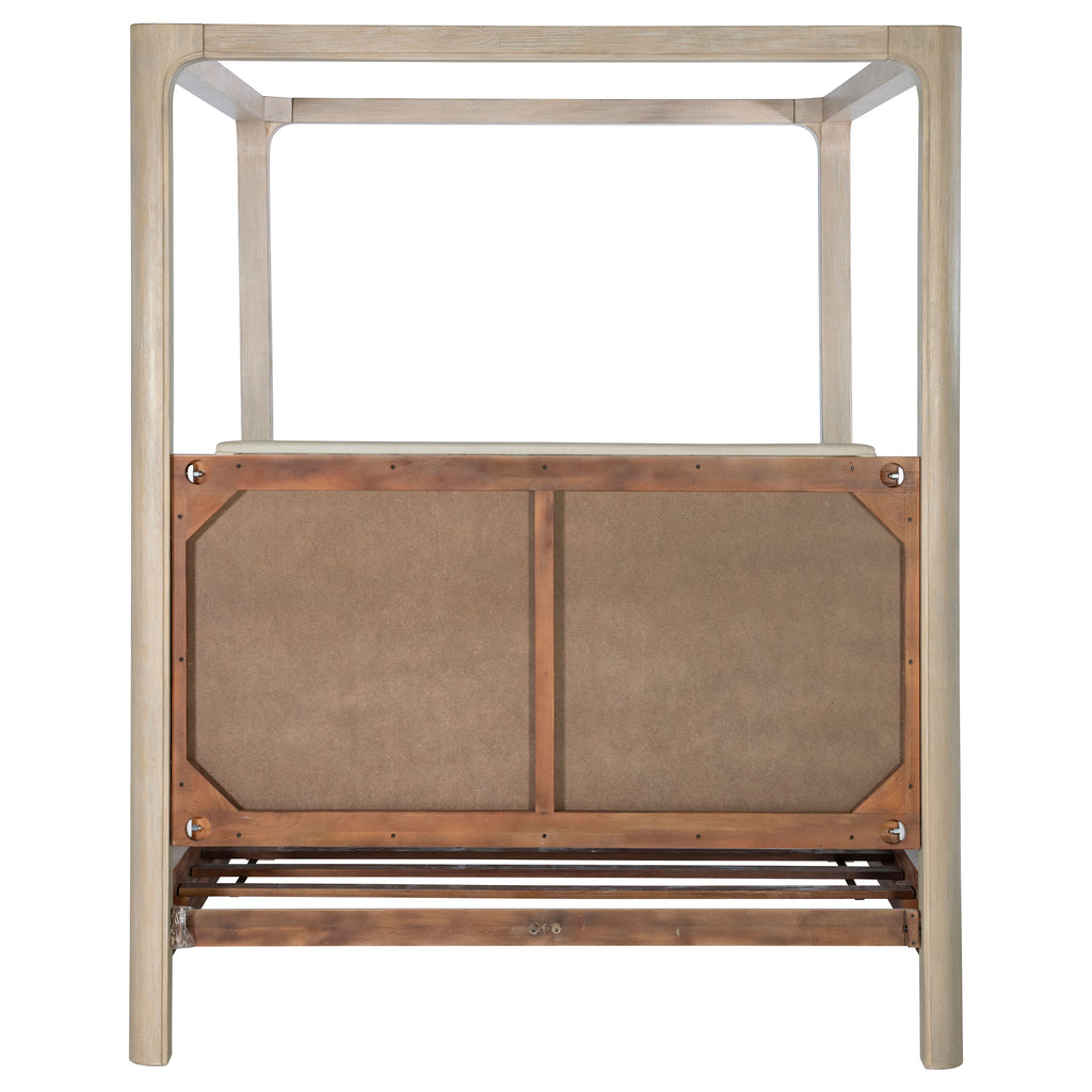 Airy and architectural, this canopy bed brings sculptural presence and soft romance to the bedroom. Gracefully arched posts frame a tall silhouette, while an upholstered headboard adds a tailored layer of texture and comfort. Designed with a platform panel base, it offers lasting support without the need for a foundation. Crafted from mahogany, engineered wood, mango veneer, and fabric, this piece blends strength and serenity in perfect harmony. Key Features: • Queen canopy bed with arched frame and soft upholstery for graceful architectural impact • Weathered mango finish brings organic warmth and visible wood grain to the frame • Beige upholstered headboard adds texture, comfort, and tailored visual balance • Slat kit with platform panels supports mattress without requiring a foundation • Crafted from mahogany, engineered wood, mango veneer, and soft polyester fabric • Perfect for creating a statement centerpiece with peaceful proportion and structure