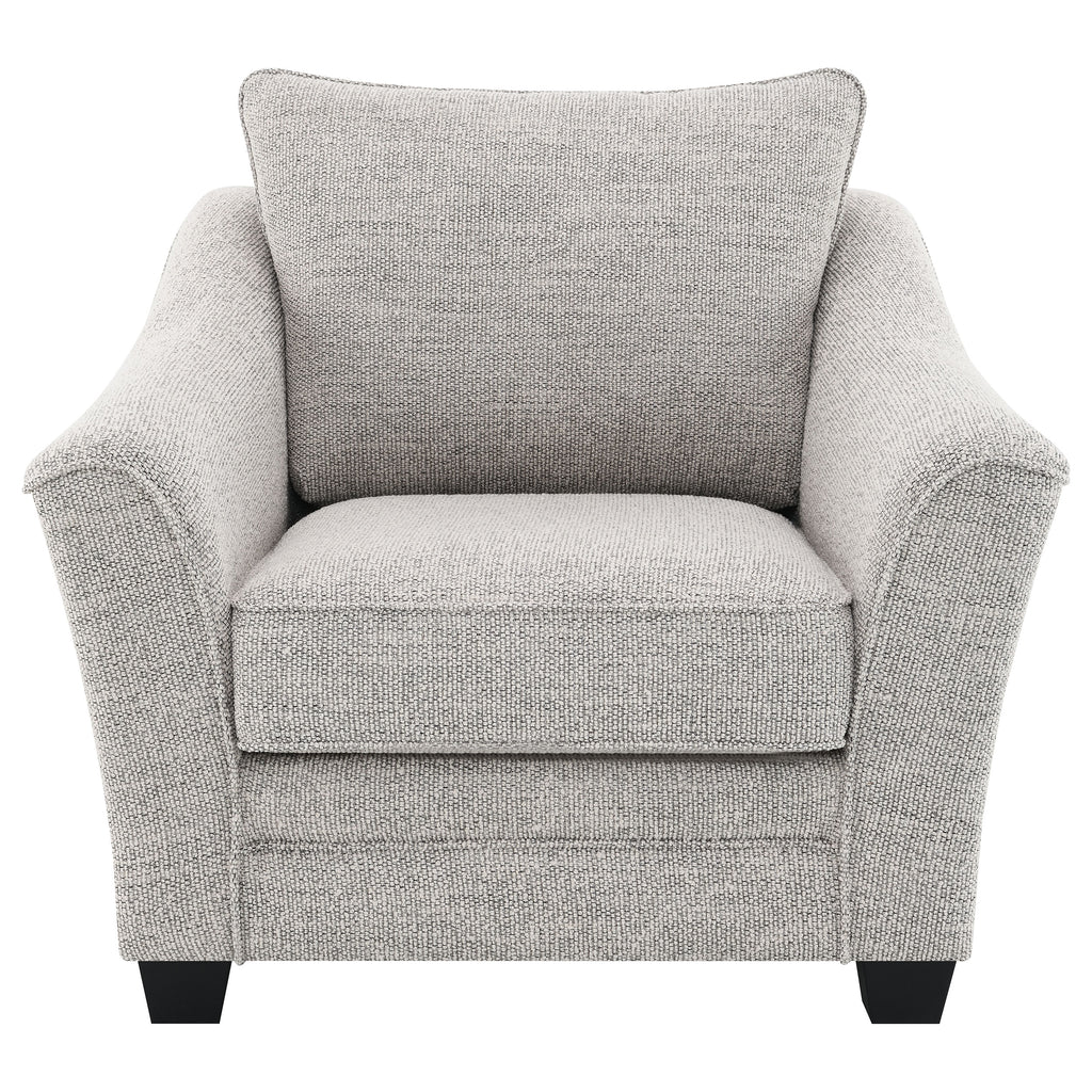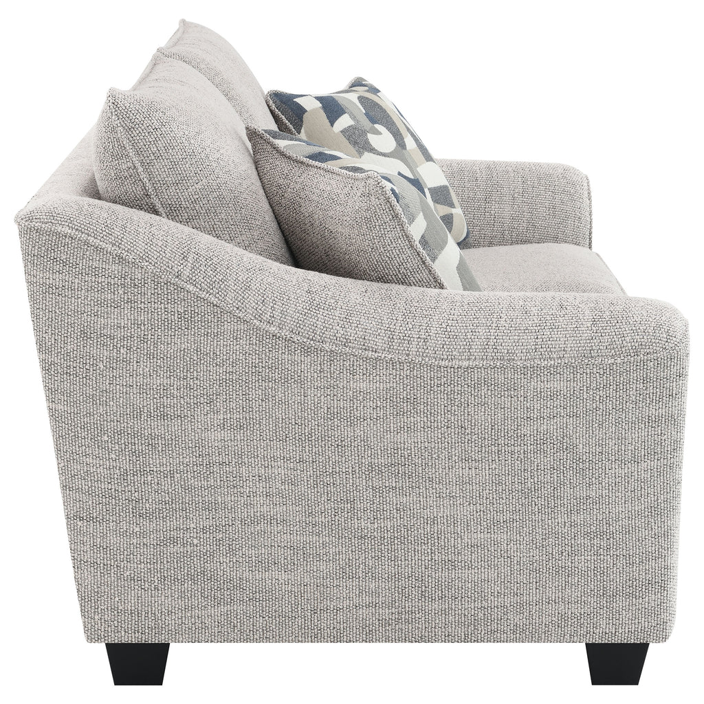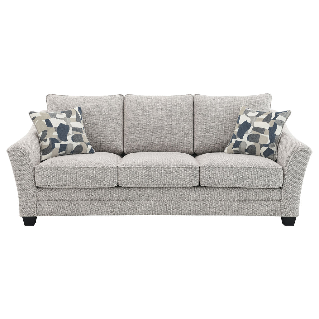Geometric accent pillows add the perfect pop of pizzazz to a two-piece modern sofa set. Ideal for a stylish but approachable living room, the set features clean lines with sloping arms that add a hint of movement. Light gray upholstery complements in a contemporary space, while plush foam cushions are complemented with sinuous springs and pocket coils for exceptional support. The sofa and loveseat feature piped trim, adding to their tailored appeal. Tapered block feet in a black finish complete the look and offer stability and durability. Key Features: • Light gray upholstery complements clean, sleek silhouetting in a modern two-piece sofa set • Wide, sloping arms feature piped trim that adds a tailored touch for a refined look and feel • Fully encased solid and engineered wood frame provides lasting durability and reliability • Features attached cushions with bold accent pillows included for added comfort and flexibility • Seats feature pocket coils and sinuous springs, creating durability and comfort in your home