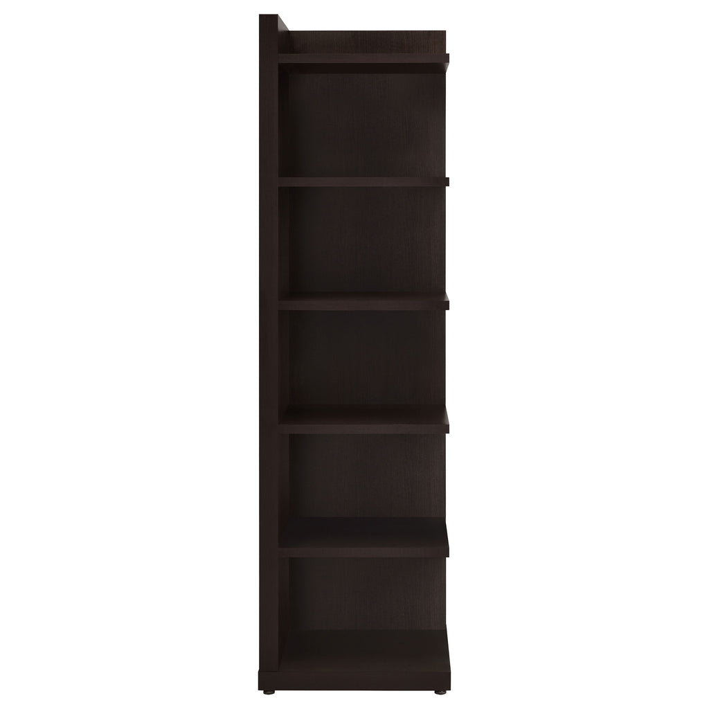 Display your book collection with style and pride. This bookcase features six convenient shelves to show off your personal library. Ideal for smaller spaces, it tucks neatly into a corner to free up precious square footage. A handsome cappuccino finish gives it a classically chic appearance. Crafted from durable MDF, particle board, and engineered veneer, this bookcase is strong, sturdy, and stunning. Key Features: • Corner bookshelf with six display tiers and deep cappuccino finish • Tall vertical frame efficiently utilizes compact corner spaces • Tiers offer open storage for books, plants, or photo displays • Engineered wood with scratch-resistant laminate veneer • Neutral finish suits traditional or transitional interiors • Tip-over restraint included for added security