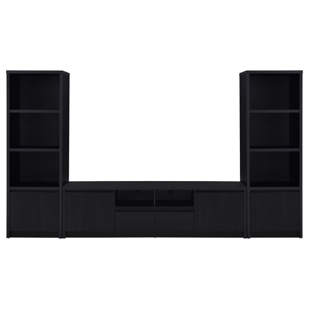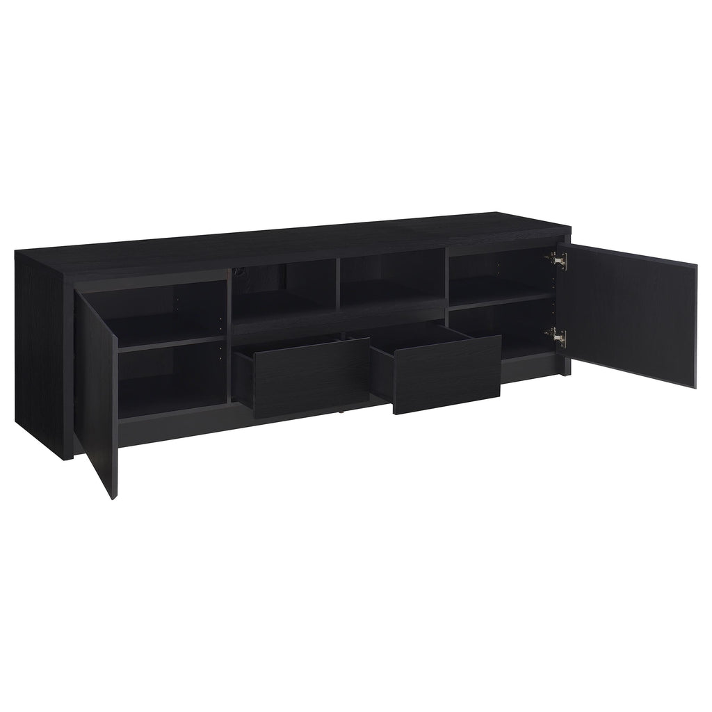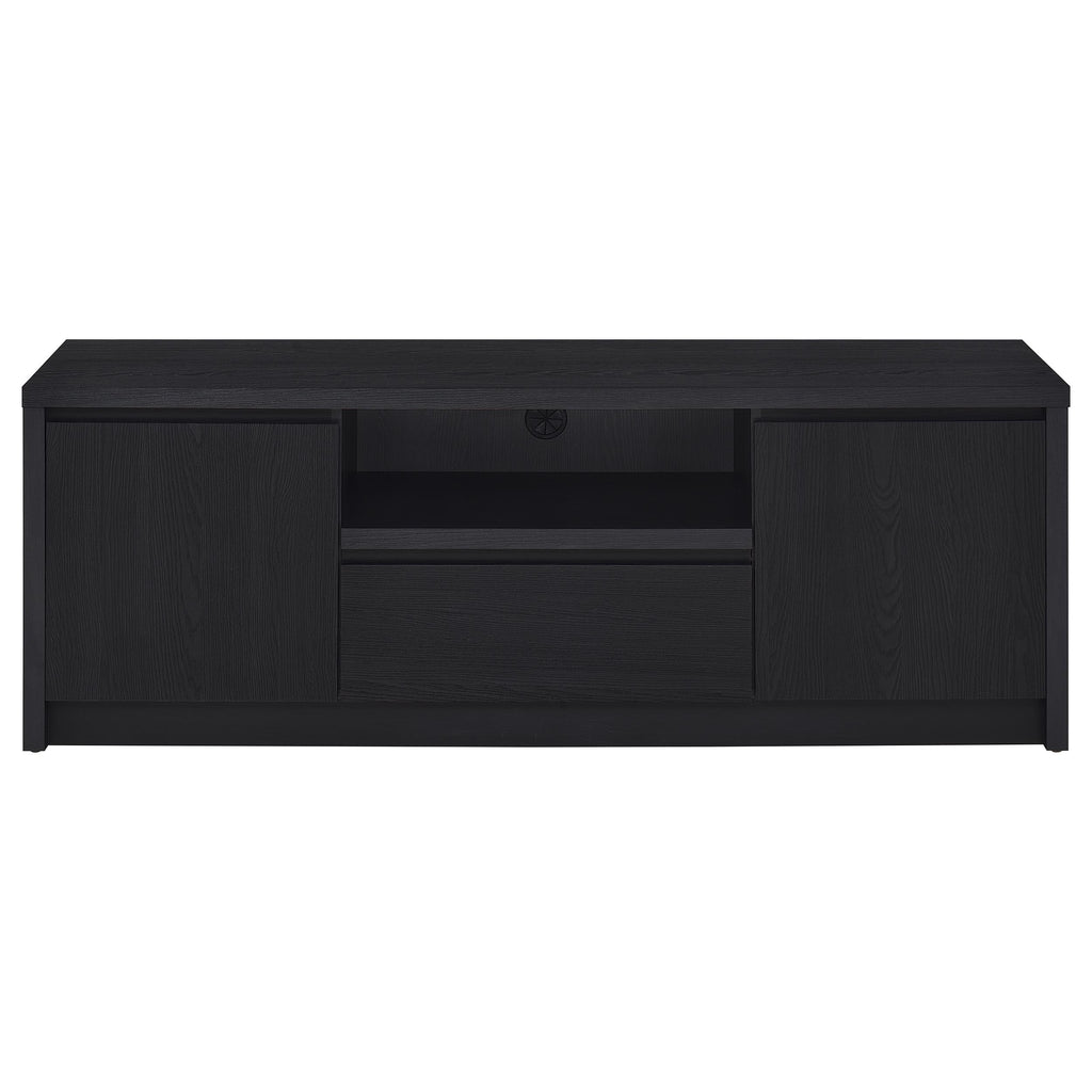 This sleek entertainment center combines a contemporary black finish with practical storage solutions. Made from durable engineered wood, it’s topped with a scratch-resistant eco-friendly laminate veneer. The unit includes two cabinets for concealed storage, an open shelf with a cable management hole for media devices, and a spacious drawer for organization. Its sturdy construction and modern silhouette make it a versatile piece for any entertainment setup.